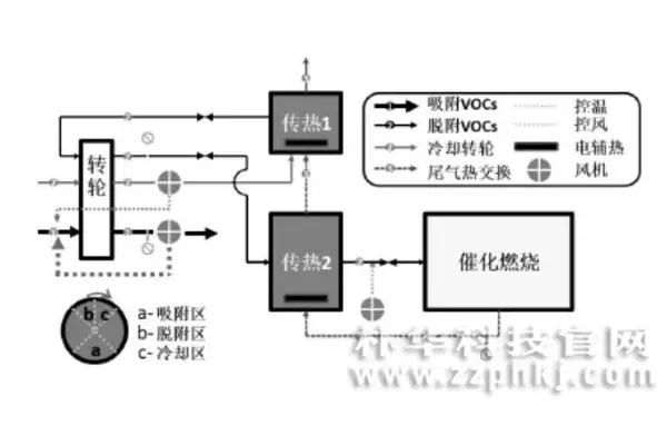 在低浓度、大风量的VOCs废气治理中,传统的VOCs废气治理方式具有设备投资大、成本高、效率低等问题,因此,出现了一种对传统技术改造的新型VOCs废气治理工艺,这项工艺采用了吸附分离的大风量工业废气中的VOCs进行分离压缩,对浓缩后的高浓度、小风量的工业废气再进行燃烧法进行再分解净化的方式,统称为吸附分离浓缩+燃烧分解净化法。