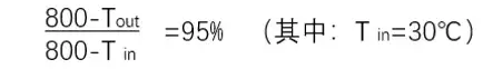 假设RTO炉膛内的均温为800℃,RTO进口温度为30℃,RTO热效率≥95%,计算RTO出口温度及进出口温差,即: