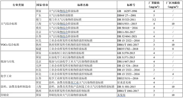 为防止企业通过增加无组织逸散的方式实现有组织排放达标,进一步监控企业对生产过程中VOCs排放环节的收集效果,不少标准规定了企业厂区内无组织排放监控点浓度限值,并对无组织监控点及监测要求作出了明确规定。朴华科技整理了国内相关标准中对无组织排放限值的要求汇总。
